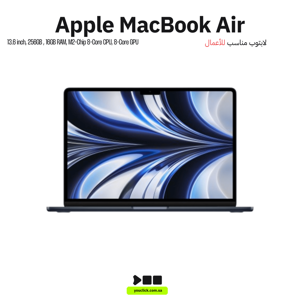 يقدم ابل ماك بوك اير بتصميمه النحيف وخفة وزنه أداءً قويًا وتجربة استخدام احترافية بفضل شريحة Apple M2، مما يجعله خياراً مثالياً للطلاب، المحترفين، والمبدعين.