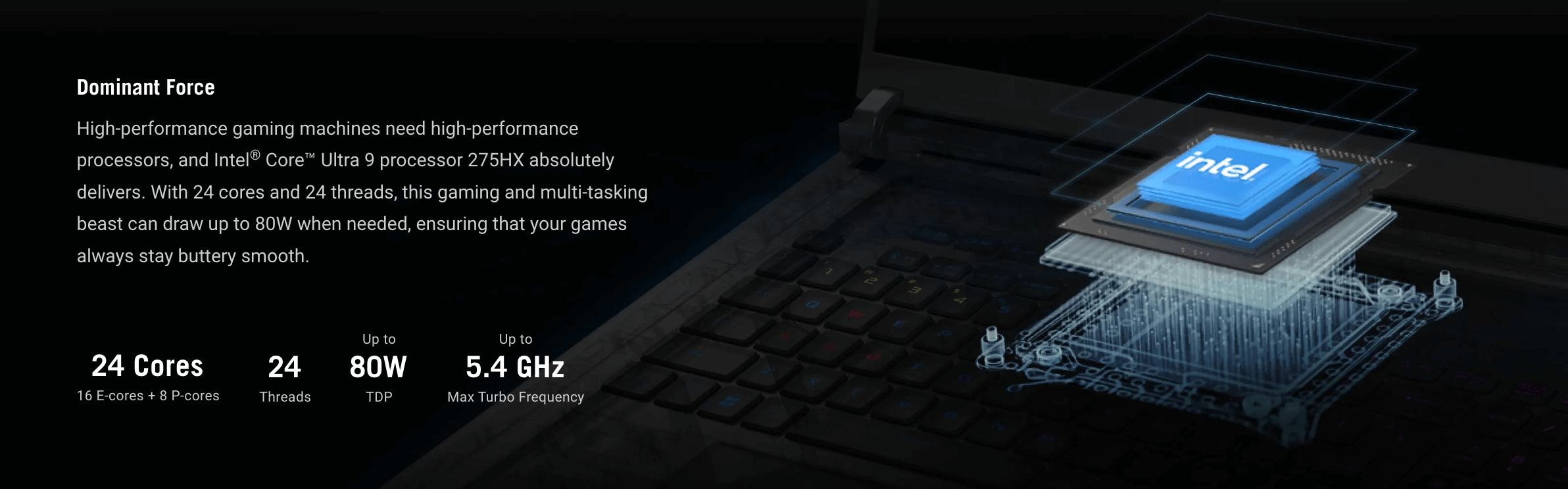 تقنية المعالج : Intel® Core™ Ultra 9 Processor 275HX 2.7 GHz (36MB Cache, up to 5.4 GHz, 24 cores, 24 Threads); Intel® AI Boost NPU up to 13 TOPS
