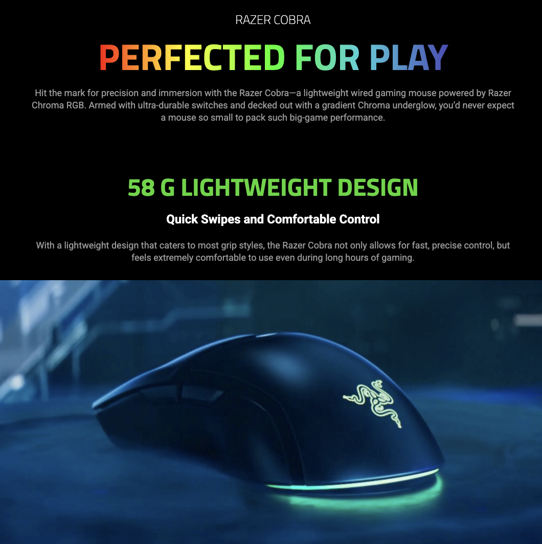 Razer Cobra Gaming Mouse: 58g, Gen-3 Optical Switches, Chroma RGB Lighting, 8500 DPI Sensor, PTFE Feet, Speedflex Cable - Black