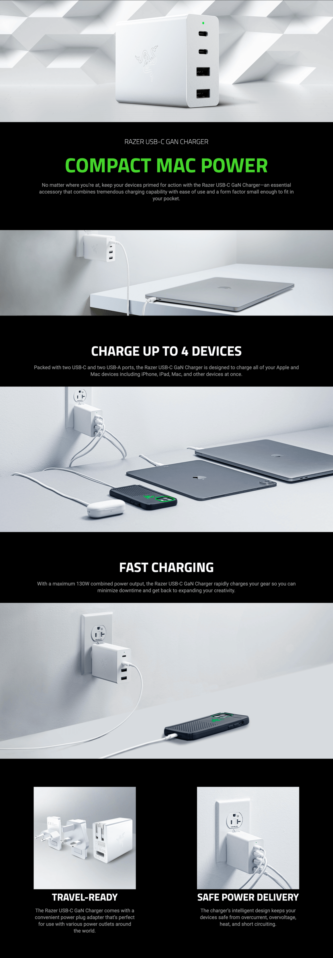 Razer USB-C 130W GaN Charger, Mobility In Mind, Fast Charging, Charge Up To 4 Devices, Safer Power Delivery, Compatible With Laptops / Tablet / Smartphone, Mercury White | RC21-01700200-R3M1