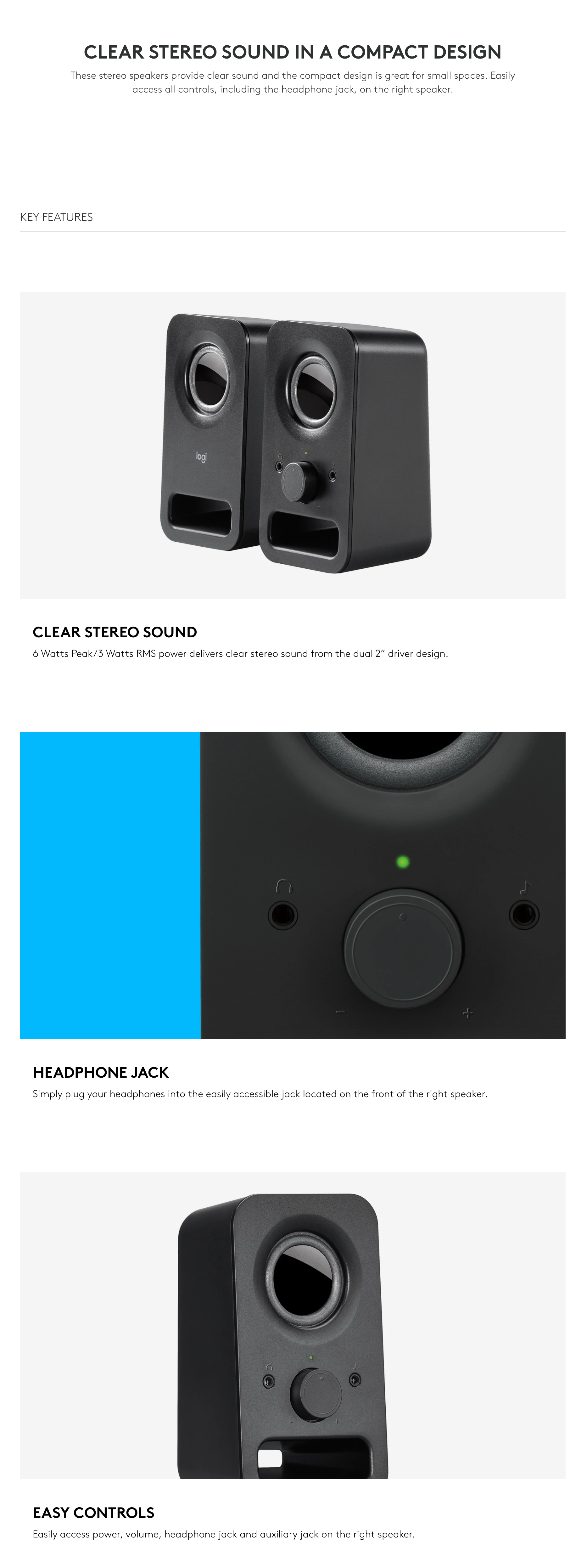 Controls: Power and volume control on the right speaker